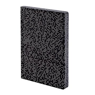 Flexcover - mekana i elastična navlaka koja je istovremeno i posebno izdržljiva. Obložena u vegansku kožu, Jeans Label – materijal koji podnosi velika opterećenja, ekološki je prihvatljiv, a s vremenom dobiva privlačniji izgled. - Mrežica sa sivim točkicama 3,5 mm. - Bilježnica sastoji se od ušivenih listova papira. - obojane stranice - Sitotisak u boji na rubovima bilježnice. - Offset papir 120 g/m2. - Broj stranica: 160. - Dimenzije: 135 mm x 200 mm